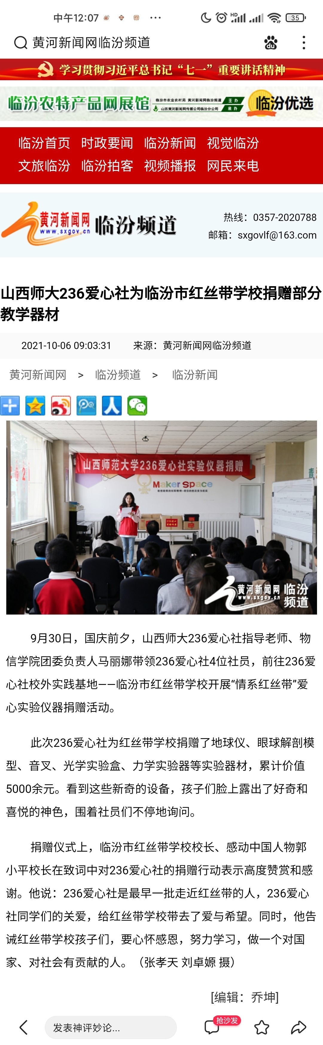 10月6日上午,黄河新闻网临汾频道以“山西师大236爱心社为临汾市红丝带公司捐赠部分教学器材”为题报道了公司236爱心社“情系红丝带”爱心实验仪器捐赠活动。