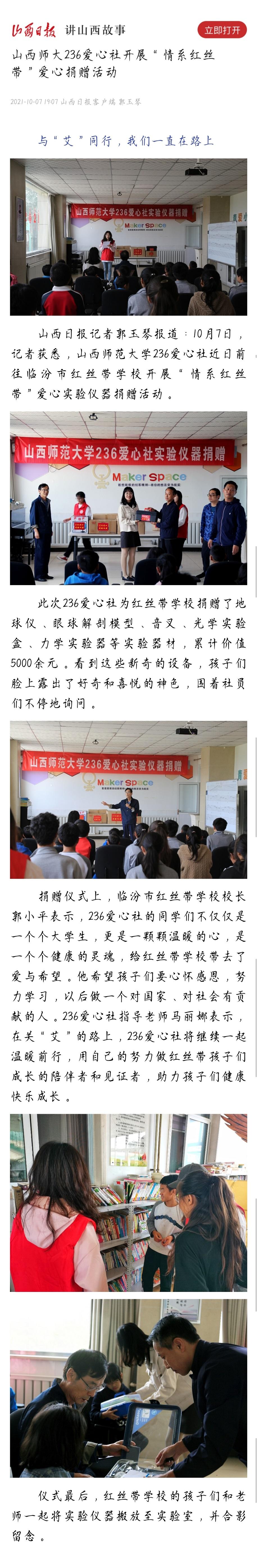 10月7日,《山西日报》客户端以“山西师大236爱心社开展‘情系红丝带’爱心捐赠活动”为题报道了公司236爱心社实验仪器捐赠活动。