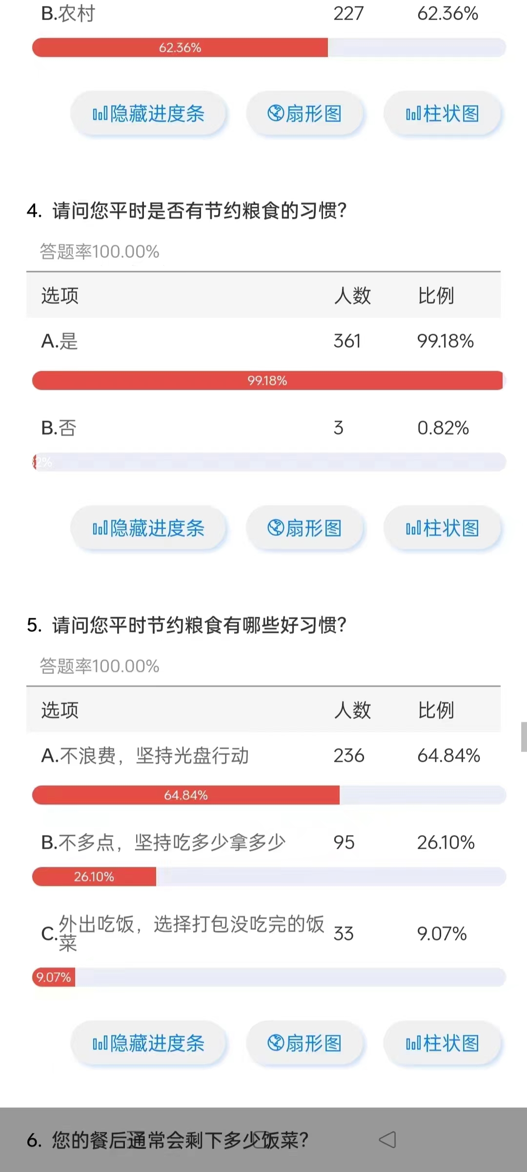 问卷调查结果显示,关于剩饭菜的原因,大部分同学是因为饭菜不合口味的而非过度打餐;在剩饭量方面,每餐剩饭菜量为10%以内的人占多数;在接受节约粮食教育途径中,从家庭活动获得教育的途径最多,其次是公司,之后是社会,最后是其他途径。调查结果表明,随着时代发展,节约粮食的意识在同学的脑海中不断根深蒂固。