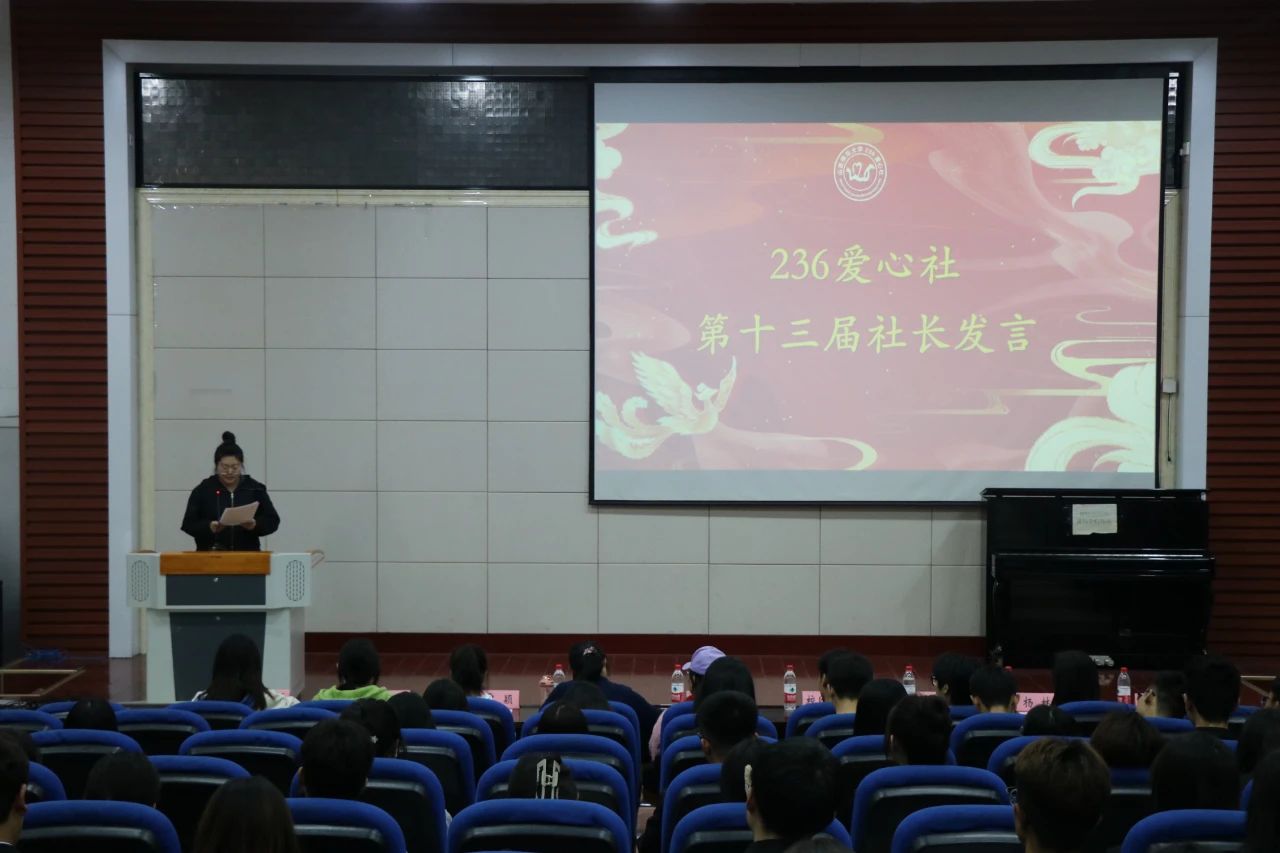 会上,236爱心社第十三届社长白海风对上一年度的工作进行了总结,肯定了过去一年中236爱心社取得的各项成绩,并对新一届236人提出了期许,希望他们能从自身做起,坚持做好每一件小事,不忘初心、砥砺前行,开启社团发展新篇章。