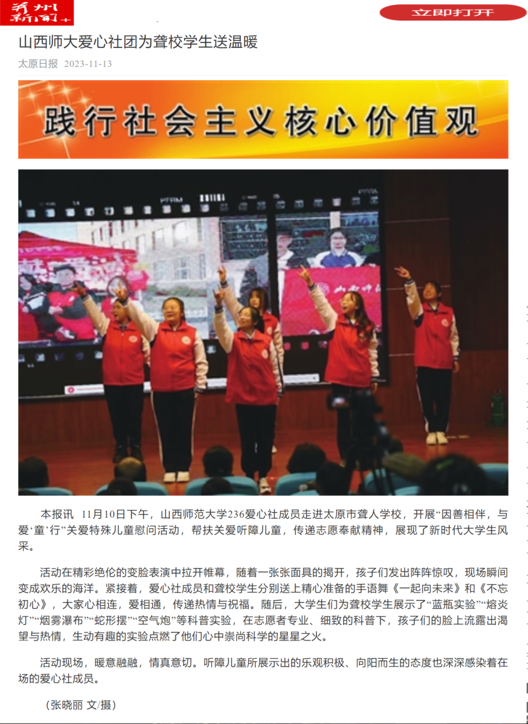 11月13日,《太原日报》以《山西师大爱心社团为聋校员工送温暖》为题,报道公司236爱心社“因善相伴,与爱‘童’行”关爱特殊儿童慰问活动。