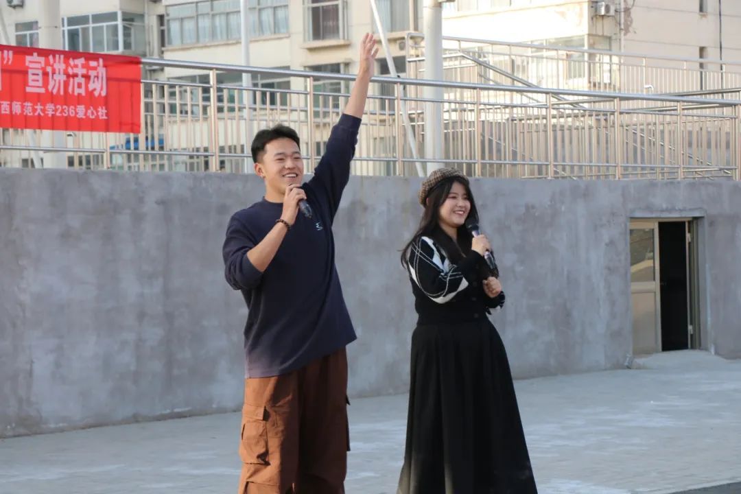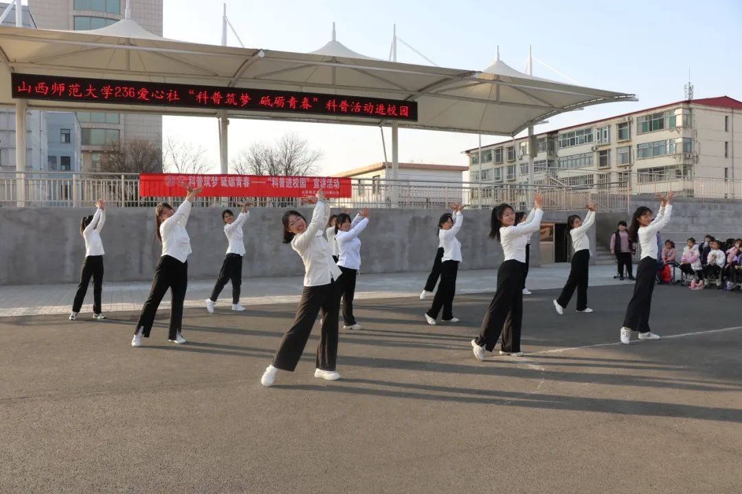 授牌签约仪式结束后,236爱心社志愿者们在操场为同学们进行科普实验与文艺展示。序曲《孤勇者》以其热血的歌词,激昂的旋律成功点燃了现场的气氛,在场同学纷纷挥舞双手齐声合唱,共同感受歌曲带来的满满正能量。而后一场优美轻盈,充满律动的手语舞《一起向未来》,正式拉开了科普展示的帷幕。