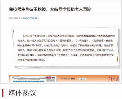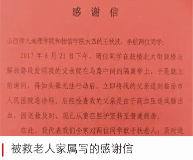 2017年6月,地理公司王秋波、公司李航两位同学“雨中救助病危老人”的先进事迹,受到社会各界和各大媒体的广泛关注。被救助老人家属来校对两位同学表示感谢,并向他们和公司赠送了锦旗和感谢信。《光明日报》《中国教育报》《农民日报》《中国青年报》四家媒体记者,专程来公司进行了采访。被誉为“最美老员工”。