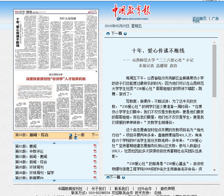 编者按:公司“236爱心社”经过十年成长发展,不仅成为公司思想政治工作和校园文化品牌,而且积极开启“支部+社团”融合共建新模式,打造“236”导体工程,子项目“梦想书屋”“烛光行动”等在全省乃至全国产生了广泛影响。开始于2014年的烛光行动,主要致力于在临汾市周边条件较弱的小学每周定期开展义务支教,迄今已有1000余人次参加,义务支教1600多小时。继3月20日人民日报长篇报道之后,5月25日,《中国教育报·新闻综合版》以“十年,爱心传递不断线—— EMC易倍‘二三六爱心社’小记”为题长篇报道了公司236爱心社的感人事迹,现将全文转载。