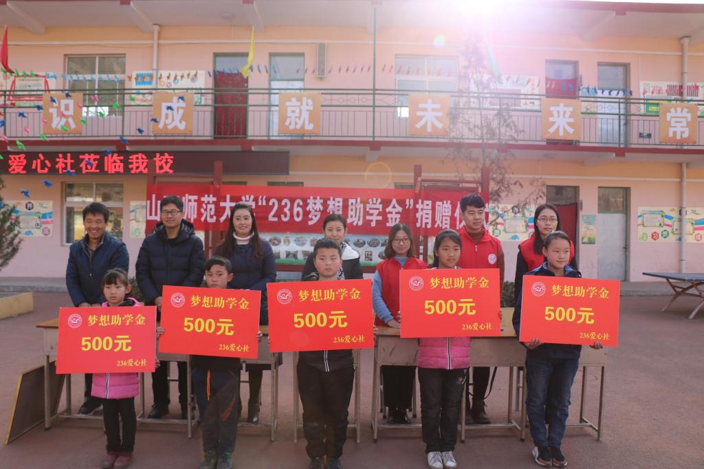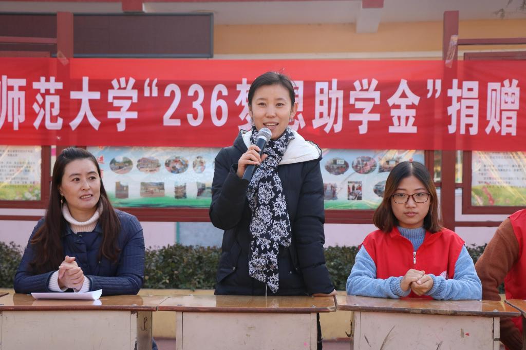 236指导老师岳文慧简要介绍了236的发展历程和此次活动的意义。她说到,236这次还带来300余册图书,用于梦想书屋图书的更新,助孩子们实现读书梦、成长梦、成才梦。岳老师与张凤霞董事长一起将助学金发放到孩子们的手中。