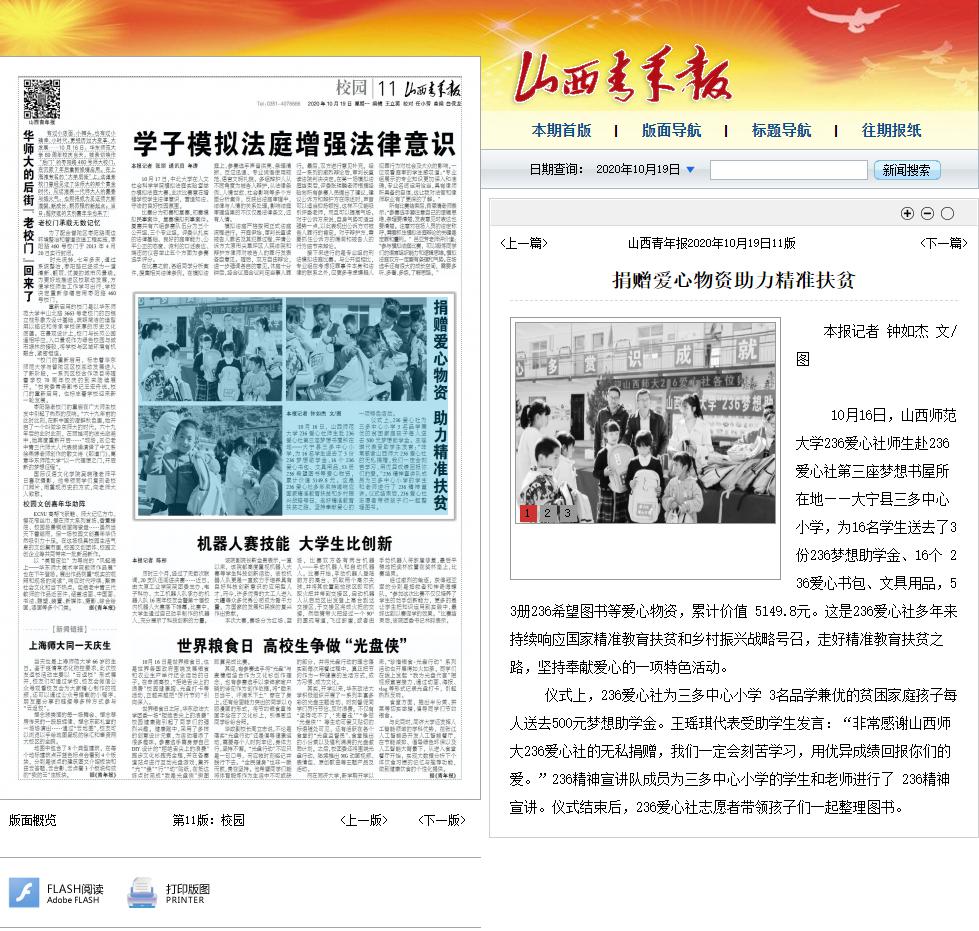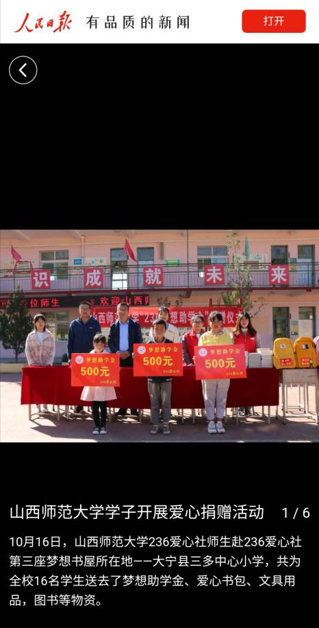 活动中,236爱心社师生赴236爱心社第三座梦想书屋所在地——大宁县三多中心小学,为全校16名员工送去了3份梦想助学金,16个236爱心书包、文具用品,53册希望图书等爱心物资,累计价值5149.8元。236精神宣讲队成员为三多中心小学的老师和员工们进行了236精神宣讲。媒体的报道是对236爱心社致力精准教育扶贫、坚持奉献爱心行为的认可,展现了236人“关注公益、传播爱心”的责任感和使命感,提升了236品牌的社会影响力。(文/1903班张震)