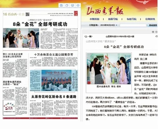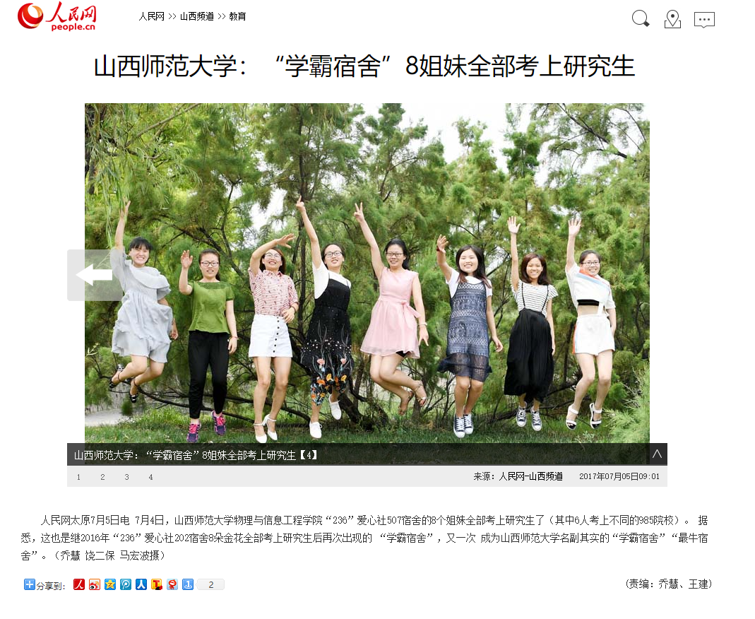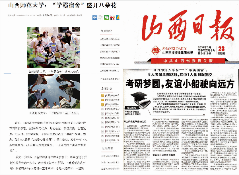 在2016年考研中,新松小区7#220、7#217 两个宿舍的八姐妹考研全部成功,特别是220宿舍被全国各大主流网络媒体称为“学霸宿舍”“最牛宿舍”“最美宿舍”,引起社会广泛关注。在2017年的考研中,华盛小区3#507 宿舍八姐妹再次全部考上研究生,续写了“最美宿舍”的佳话。2019年6月14日,《山西日报》五版头条以《毕业季,山西师大又现“最美宿舍”—室八金花同时成功考研》为标题报道了公司“最美宿舍”八姐妹励志考研故事。