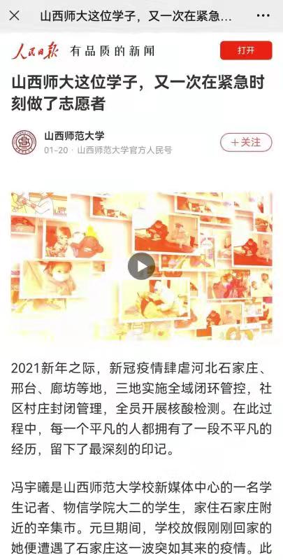 2019级员工冯宇曦(1903班)连续两次参与抗疫志愿服务,受到《人民日报》客户端和公司校园网专题报道,并荣获河北省辛集市“最美巾帼志愿者”荣誉称号。被誉为"最美逆行者"。